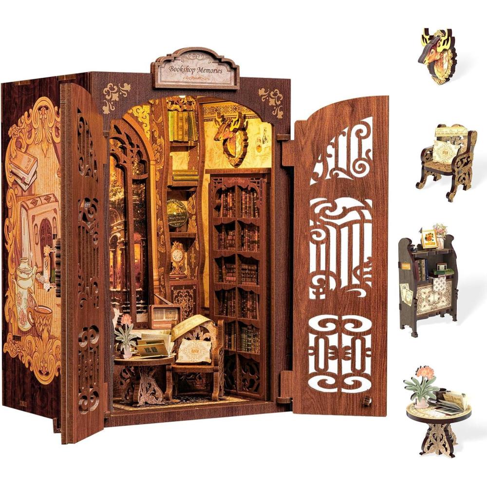 CUTEBEE DIY Book Nook Kit, Miniature House Kits for Adult and Teens, DIY Miniature Book Nook kit with Sensor Led Light, Gifts for Lovers and Family (Muse Bookstore)(Drama Bookshop)