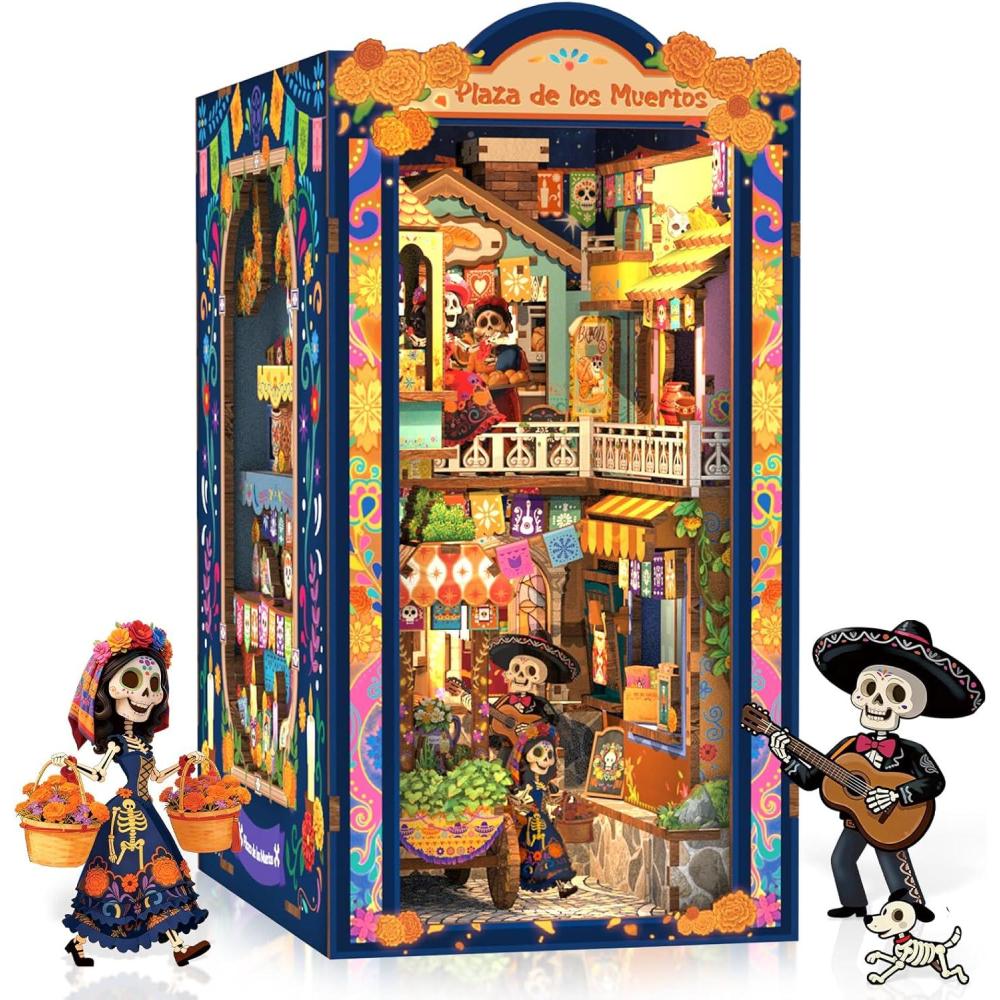 CUTEBEE Book Nook Kit – DIY Miniature House Kit for Adults, 3D Wooden Puzzle Bookshelf Insert Decor, Day of The Dead Booknook, Mexican Folklore LED Miniature Kit, Unique Gifts (Plaza de Los Muertos)